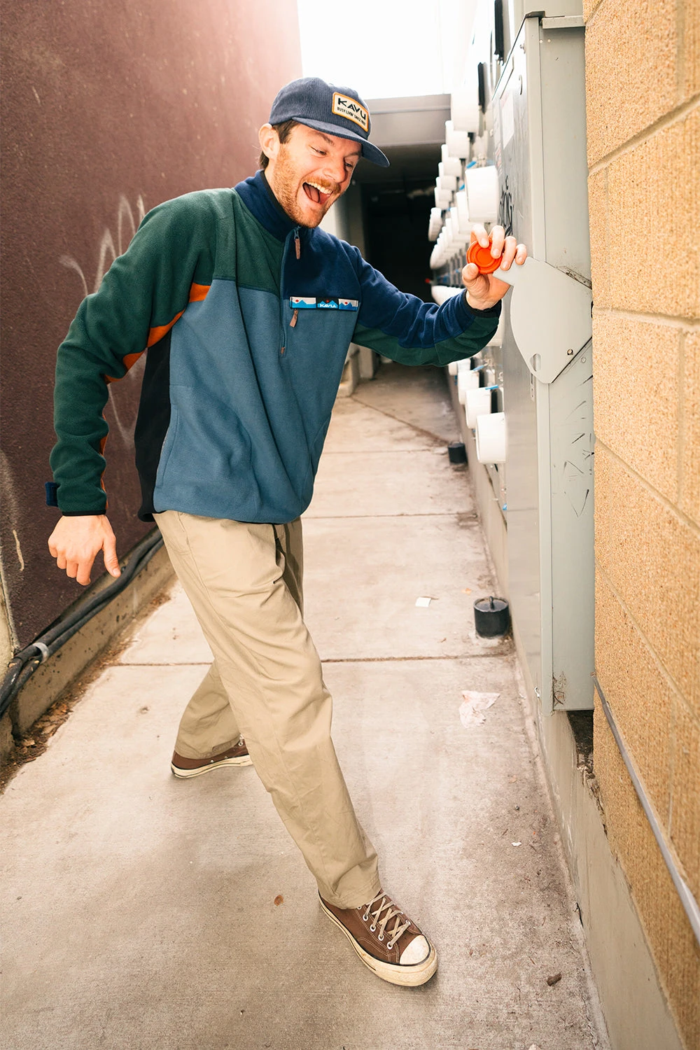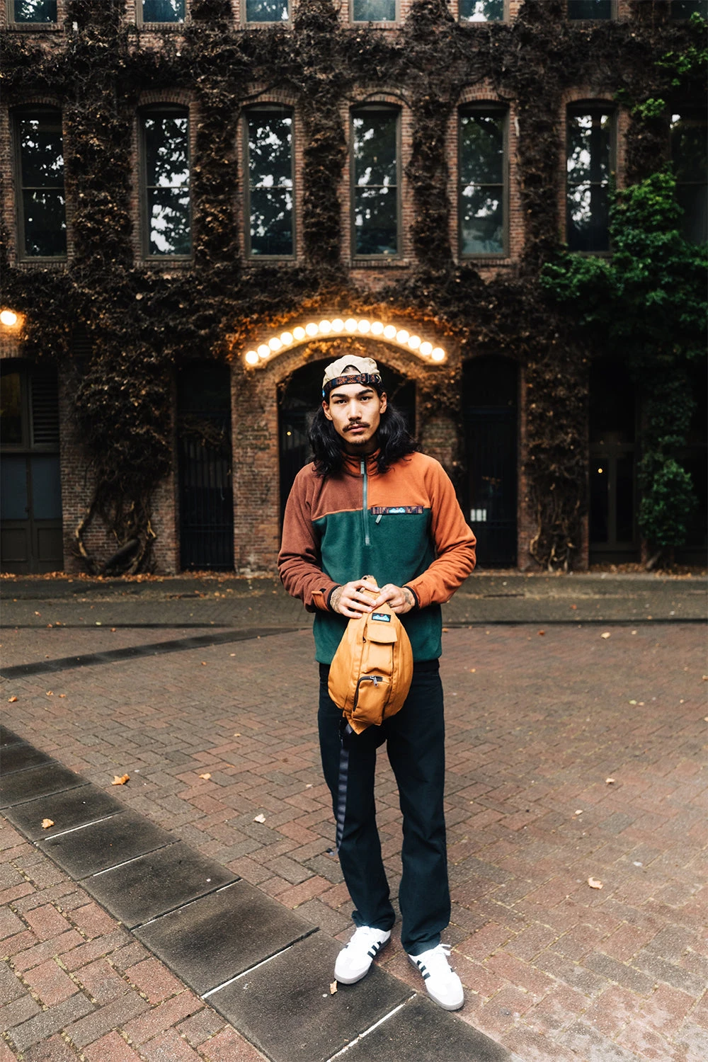 This quarter zip polar fleece is KAVU to the core. One Sasquatch inspired print and two burly solid color blocks are accented by a color coordinated strip of nylon tubular webbing on the left chest pocket. Pacific Northwest core for the win!