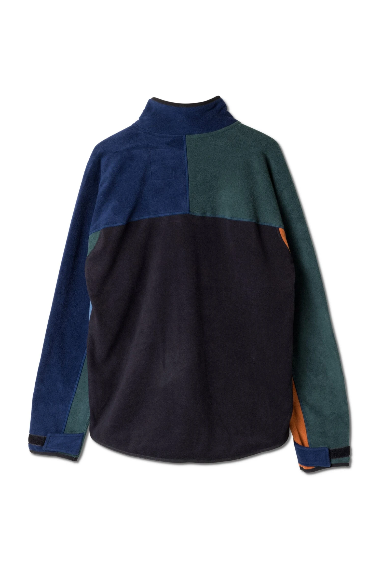 Casual fit, half zip mock neck fleece pullover, YKK plastic molded zipper with fabric pull, elastic binding on top collar edge, sleeve cuffs and bottom opening, front chest zip pocket with patterned webbing, jersey lined hand pockets, gusseted underarms, hook and loop adjustable sleeve cuffs, back drop tailed hem.