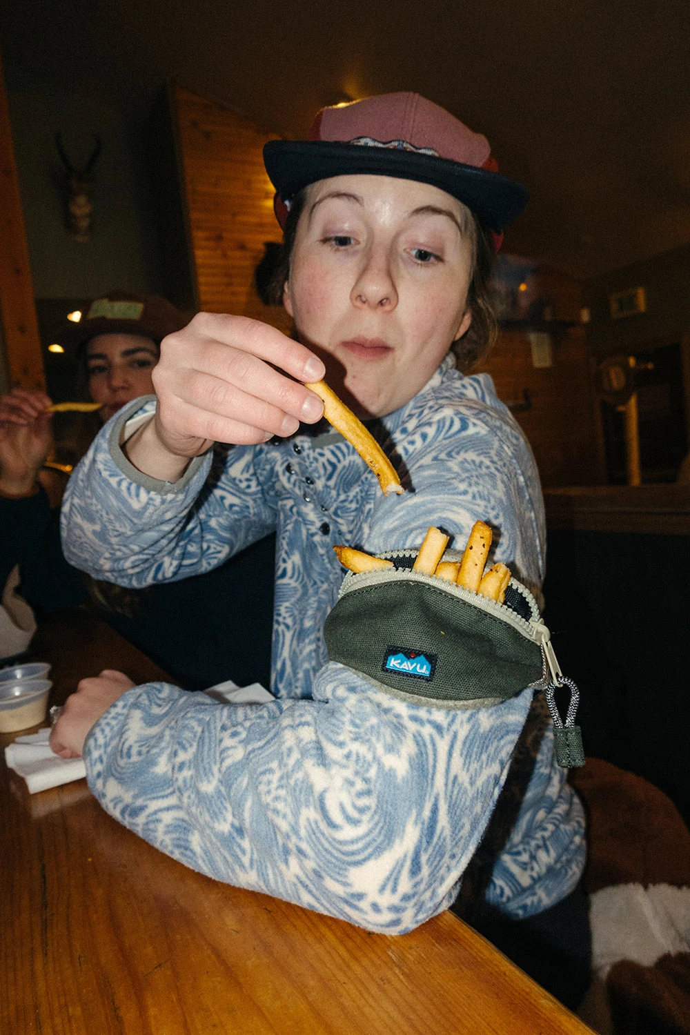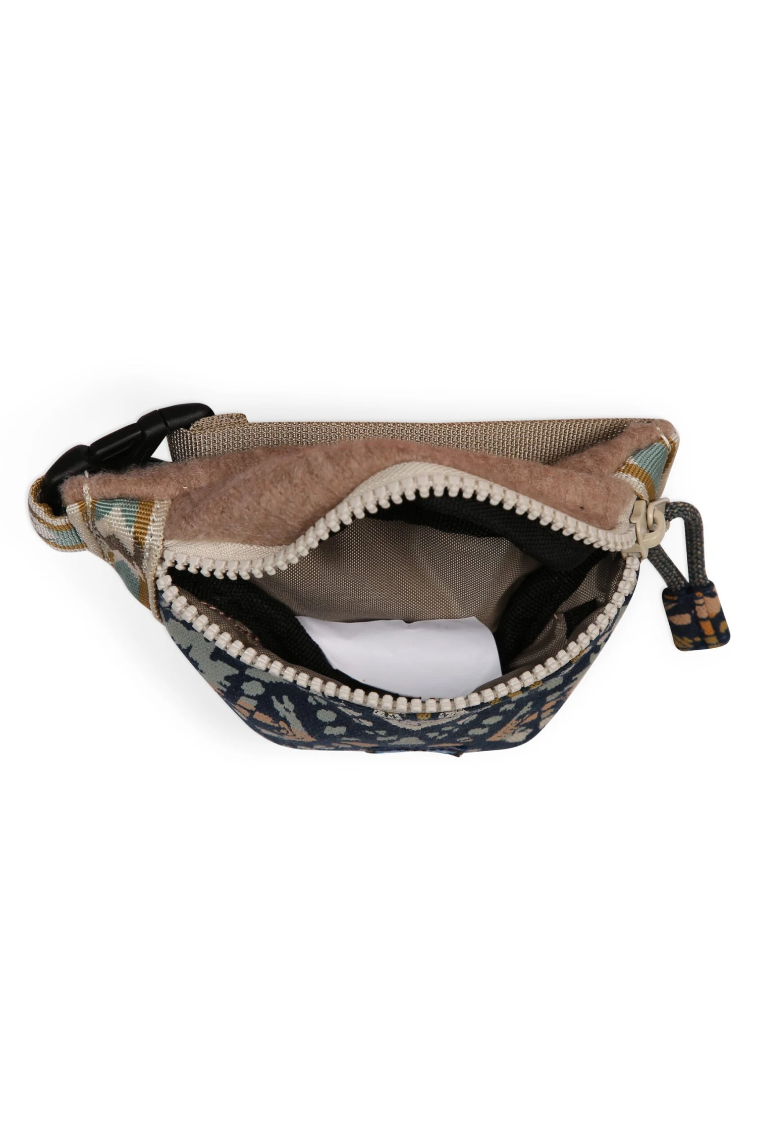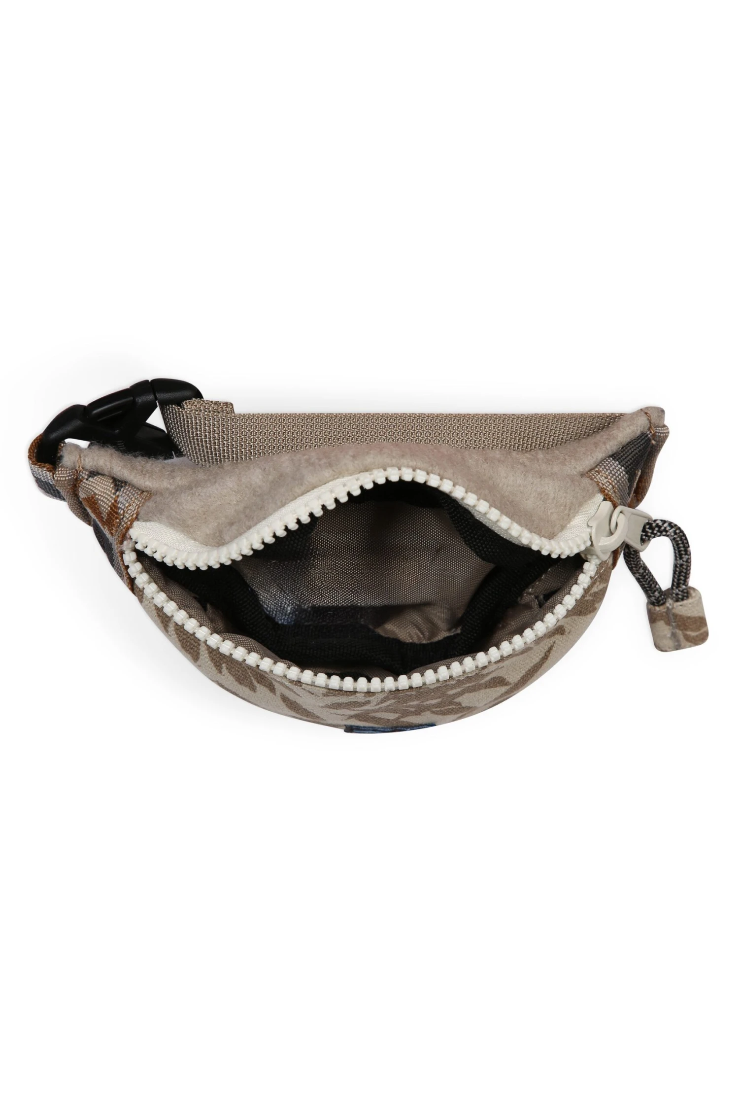 Small accessory wrist pouch, one main compartment with zip closure and rope loop zip pull, adjustable webbing strap with plastic side release buckle, rope loop zip pulls and pattern webbing detail.
