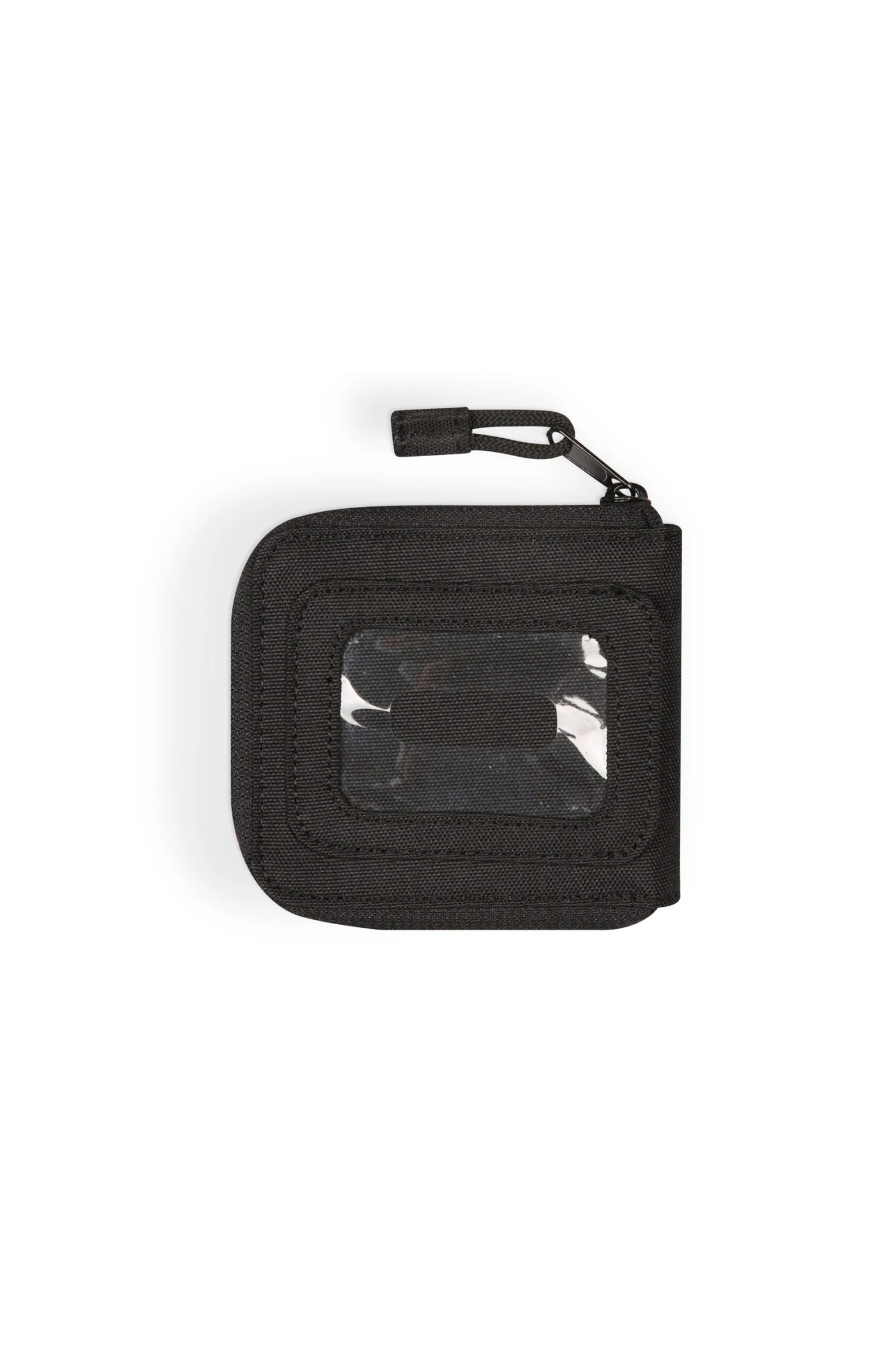 Bi-fold zip wallet, rope loop zip pull, exterior ID window, multiple internal cash (sized for international currencies) and card slots, and hook and loop coin pouch pocket.